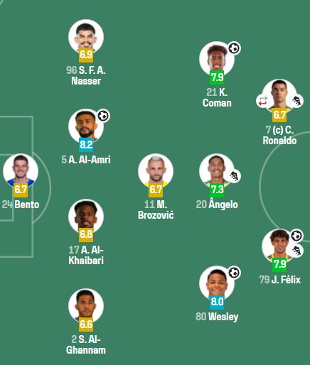 利雅得勝利上半場打入4球,C羅第42分鐘精妙挑傳為菲利克斯送出助攻。遺憾的是,C羅只有2次射門,而且都未能射正。